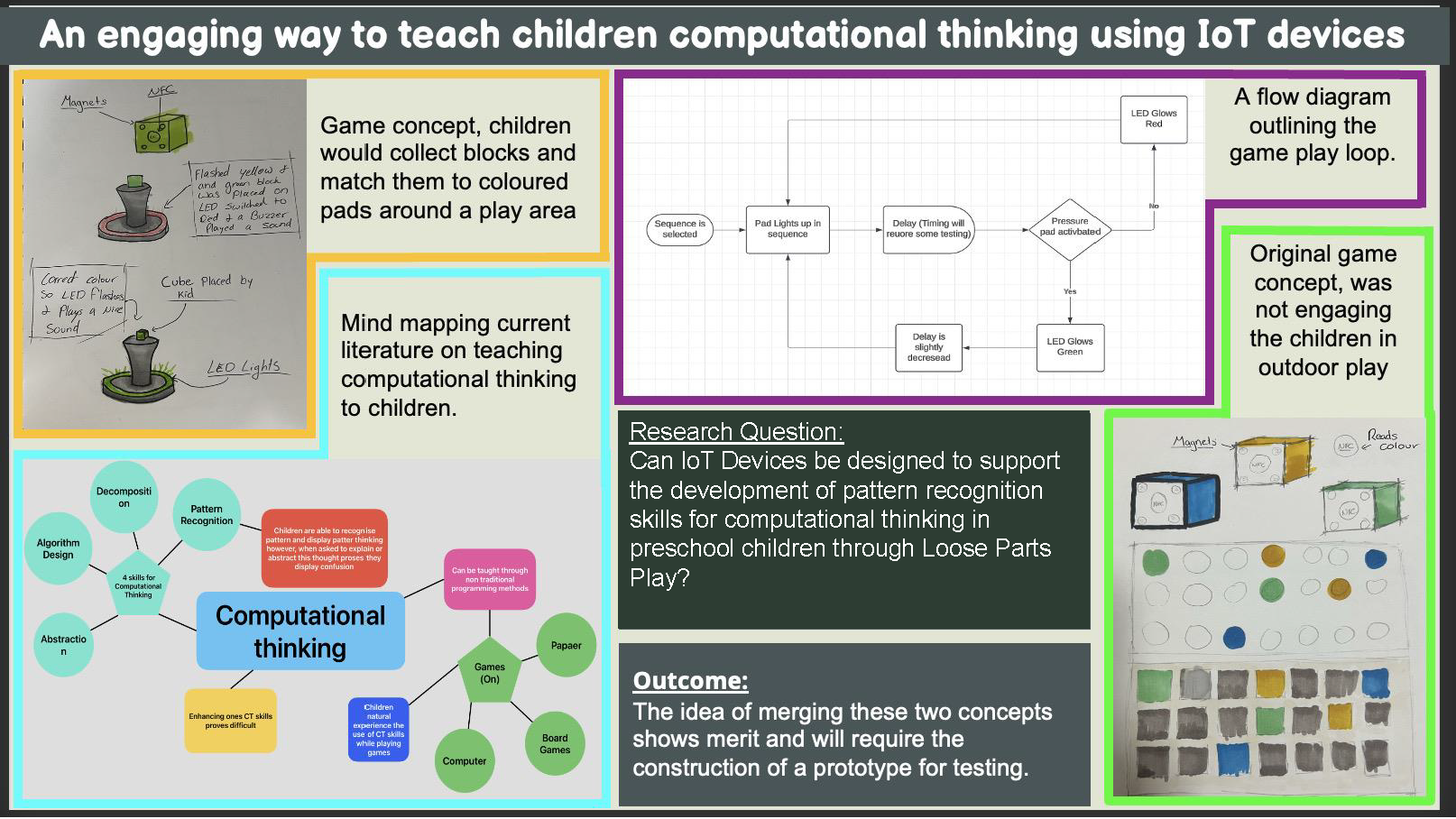 The use of digital technologies to enhance children’s learning experience is not a new concept. However, outdoor play isn’t a context that these technologies are typically designed for. In tandem, there is an ever-growing push to introduce computational thinking skills to this age group. Therefore, we asked: can IoT devices be designed to support the development of pattern recognition skills for computational thinking (CT) in preschool children through Loose Parts Play? We aimed to merge the complexities of teaching computational thinking with the principles of Loose Parts Play (LPP). LPP is a form of outdoor play that is unstructured, and the children are allowed to play in any way they want often with lose objects provided to them.
