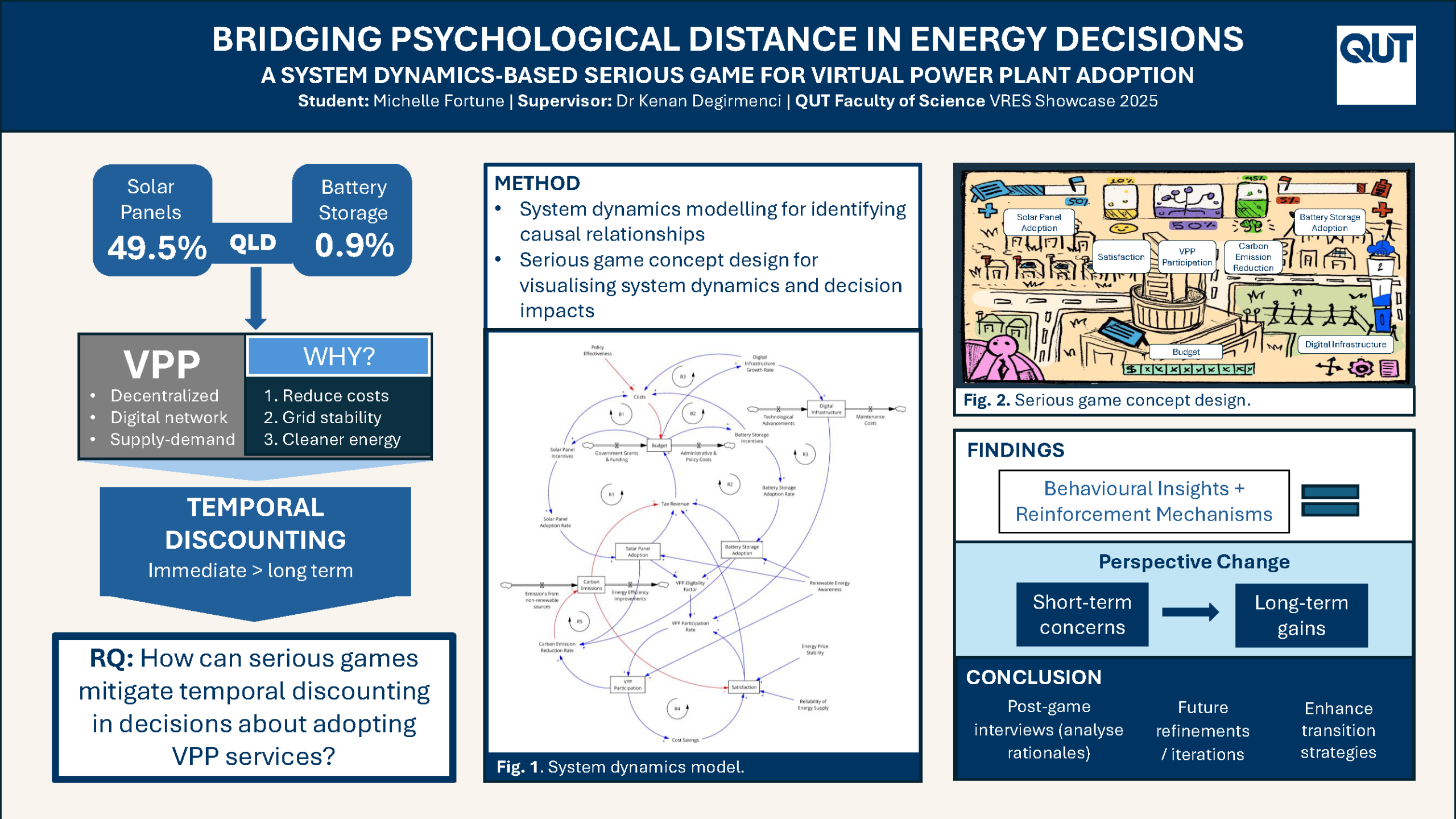 A virtual power plant (VPP) is a decentralised, cloud-based network of interconnected home solar systems and batteries that function as a unified energy source, balancing supply and demand within the network. By optimising energy distribution, VPPs reduce costs, enhance grid stability, and promote cleaner energy. In Queensland, solar panel adoption has surged, with 49.5% households installing solar systems due to long-term economic and environmental benefits. However, the adoption of storage batteries—the second core component of a VPP—remains low at just 0.9%. This disparity is likely influenced by temporal discounting, a cognitive bias that leads individuals to prioritise immediate savings over long-term benefits, ultimately hampering battery adoption among residential and industrial users.
