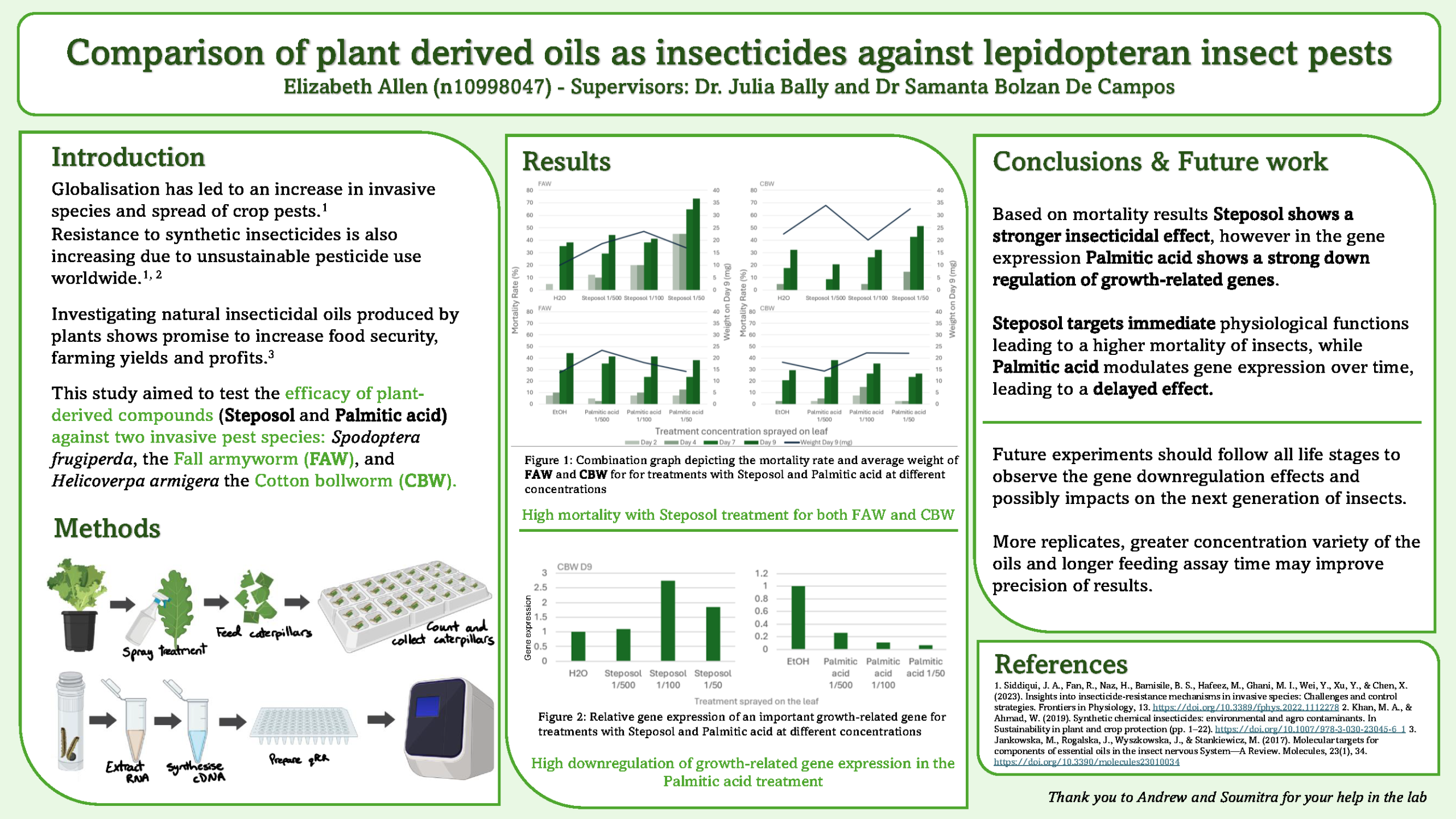Plants naturally develop chemicals which can have insecticidal effects, this project aims to investigate soy plant derived oils efficacy as pesticides against FAW and CBW on lettuce (Lactuca sativa var. longifolia). The oils’ insecticidal behaviour was measured using a feeding assay with lettuce leaves sprayed with different concentrations of diluted oils, (steposol and palmitic acid). Caterpillars were counted and weighed at intervals of two to three days to measure their growth and mortality. Caterpillars collected on days 4 and 9 had RNA extracted to measure whether the expression of stress related genes changed due to the oils in the caterpillars via qPCR.