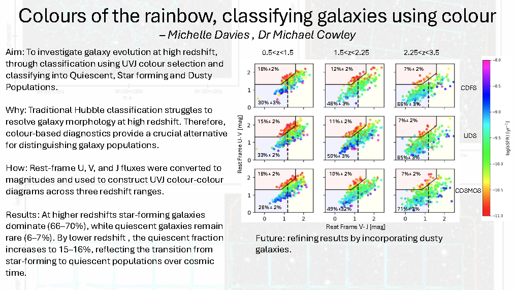Hubble’s tuning fork diagram classifies galaxies into three broad categories—Lenticulars, Ellipticals, and Spirals—based on their visual appearance. However, at high redshift, determining a clear Hubble classification is more challenging due to the lack of resolved imaging. Instead, we rely on colour-based classifications, with younger, star-forming galaxies appearing bluer and older, quiescent galaxies appearing redder.