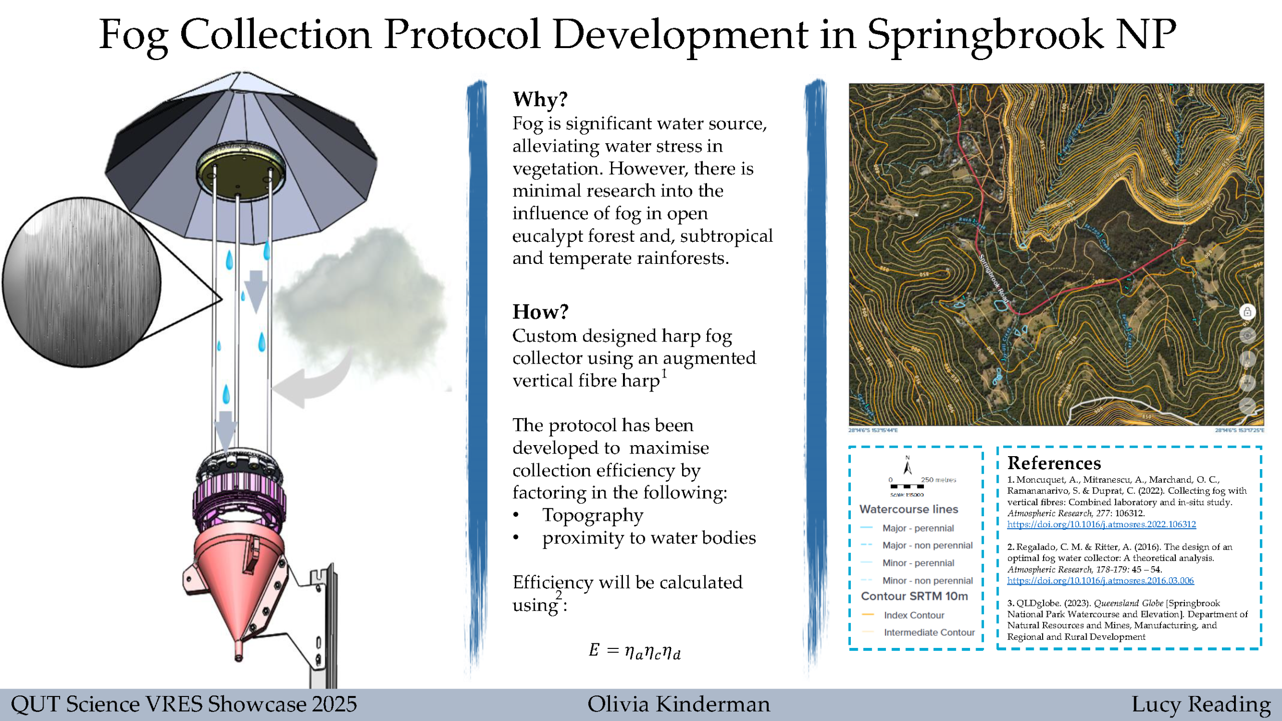 The area of focus is a part of a larger, ongoing project in collaboration with Gold Coast City Council and the groundwater monitoring initiative within Springbrook National Park, aiming to understand the resilience of the groundwater aquifers associated with the World Heritage rainforest areas. The primary focus of this VRES project is to develop a testing protocol for the custom designed harp fog collector, which incorporates a slightly augmented vertical fibre harp utilising co-fibre pair strings. This protocol  includes field testing and statistical analysis to determine the efficiency of the fog collector. Fog is considered to be a significant water source, alleviating water stress in vegetation. Fog monitoring research is largely restricted to coastal and dryland communities. However, there is minimal research into the influence of fog in open eucalyptforest and, subtropical and temperate rainforests. Insight into the ecological role of fog will assist in better understanding the water sources within Springbrook National Park. The design selection criteria for the fog collectors prioritised collection efficiency, influenced by factors such as orientation, material selection, collector and wire configuration and wire diameter. The selection criteria also required the design to have been previously successfully tested. Testing sites also influence the efficiency of the collectors and were selected based on a multitude of geographical and environmental factors such as the topography, soil moisture content, proximity to water bodies and wind patterns. The success of the fog collectors is determined by the efficiency of the fog collectors, defined by the aerodynamic and deposition efficiencies. This research will contribute to a better understanding of fog’s role in maintaining water sources and groundwater resilience within rainforest ecosystems. It is expected that future research on this topic will provide valuable insights into the water dynamics in Springbrook National Park.